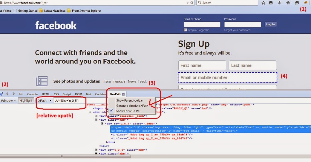 Once firebug is installed, you will see a bug icon on the right top corner of the browser, click as per the below screen order to identify the webelements.